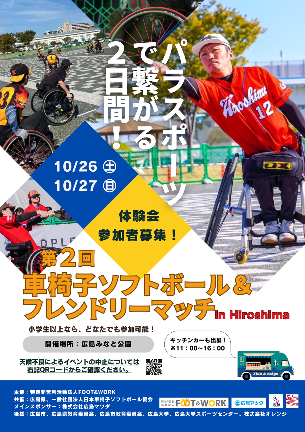 10月26日㈯・27日㈰ 広島市南区宇品の広島みなと公園にて、FOOT&WORK主催「第2回車椅子ソフトボール&フレンドリーマッチ in Hiroshima」が開催されます。