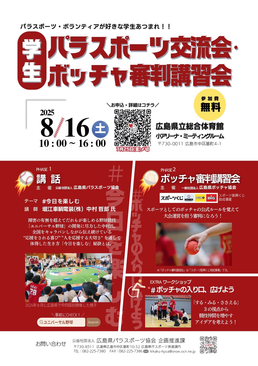 | 対象者 | 主に広島県内のパラスポーツ・ボランティアに関心がある学生、パラスポーツに関わる学生団体、医療・福祉に関わる学生。 |