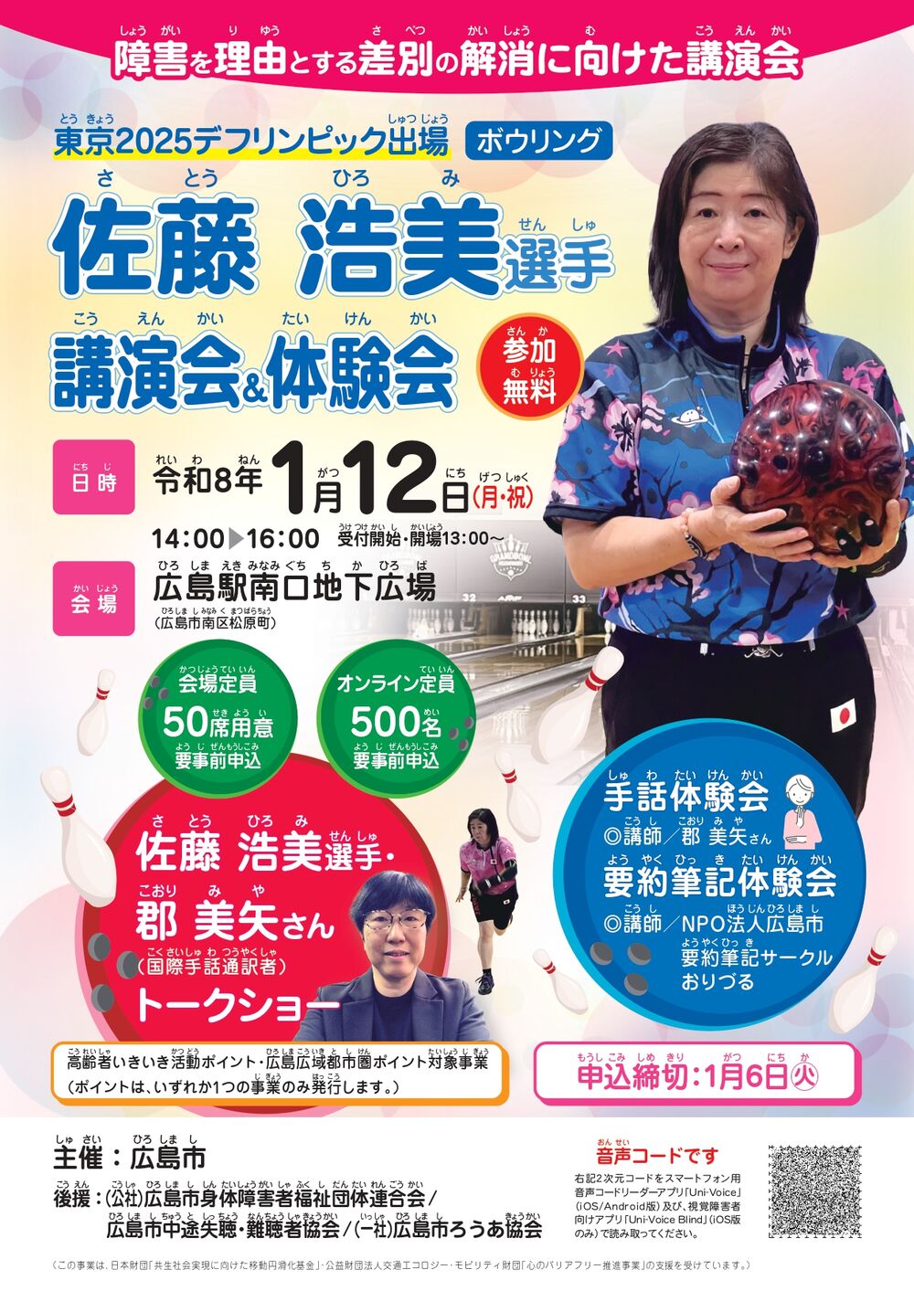 広島からボウリング女子主将としてその大舞台に挑戦した佐藤浩美選手が、デフスポーツの魅力やデフリンピックでの体験をみなさんにお話しします。