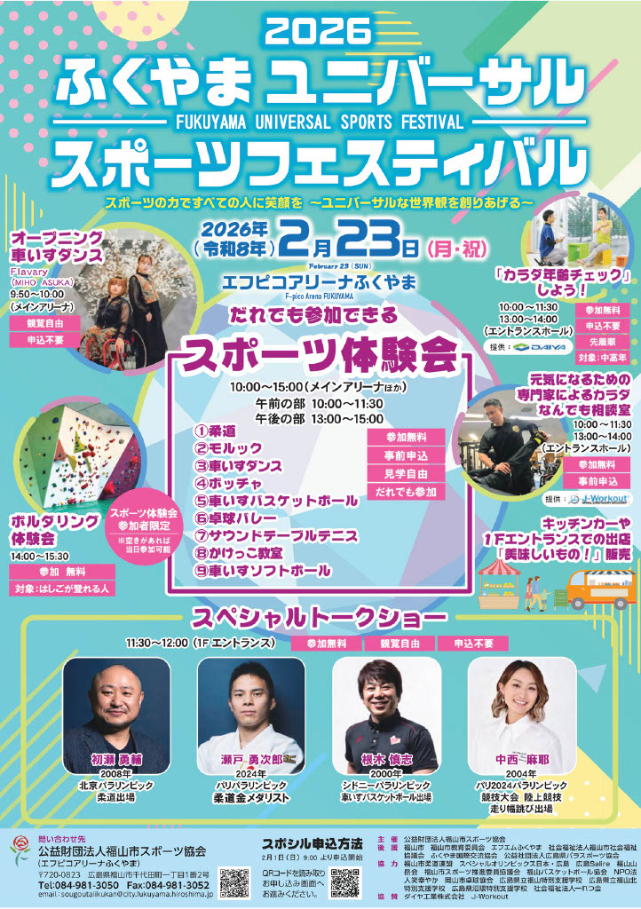 2月23日(月・祝) エフピコアリーナふくやまにて、「2026ふくやまユニバーサルスポーツフェスティバル」が開催されます。